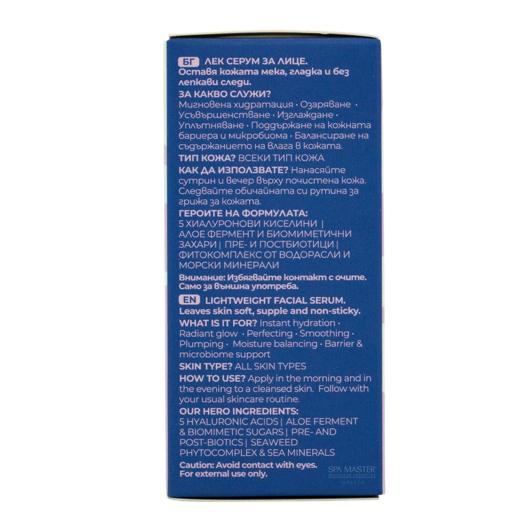 – Πέντε τύπους υαλουρονικού οξέος για πολυεπίπεδη ενυδάτωση, τόσο στην επιφάνεια όσο και σε βαθύτερες στιβάδες της επιδερμίδας.