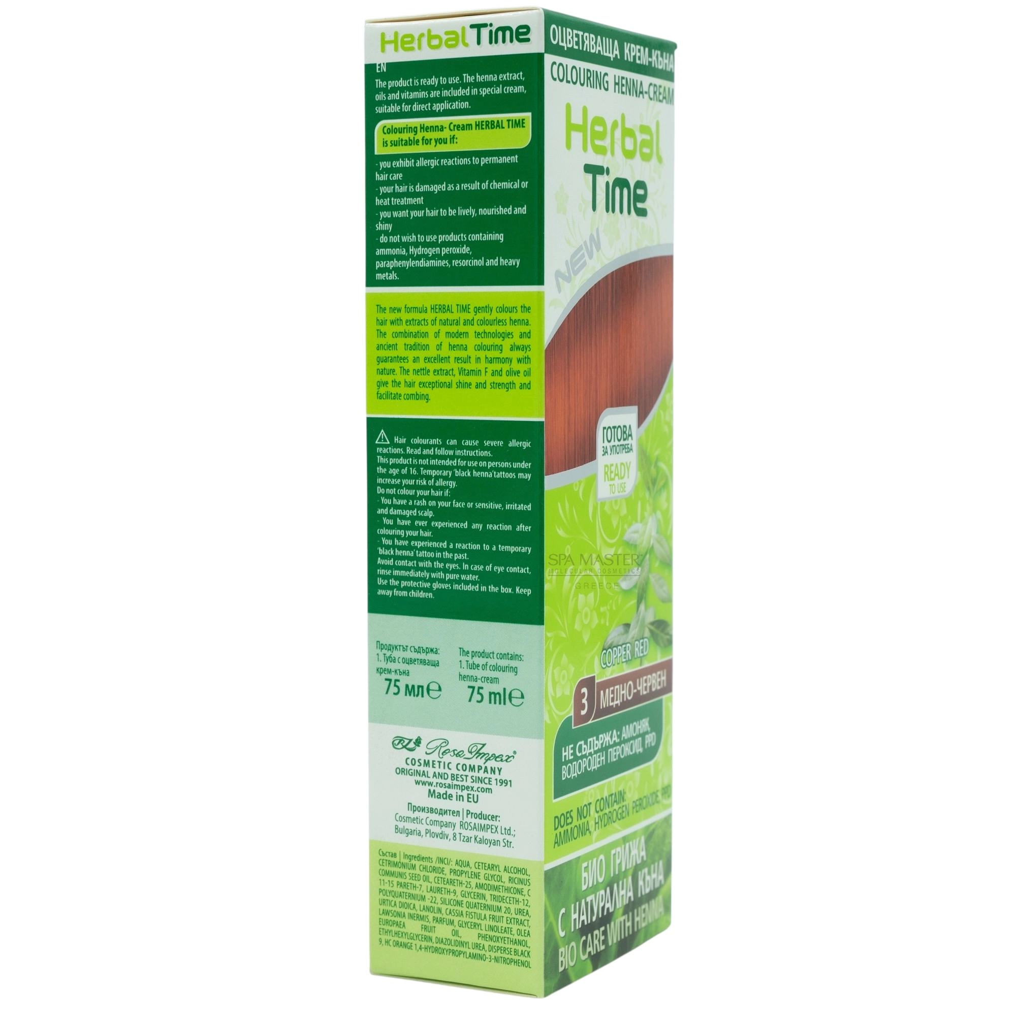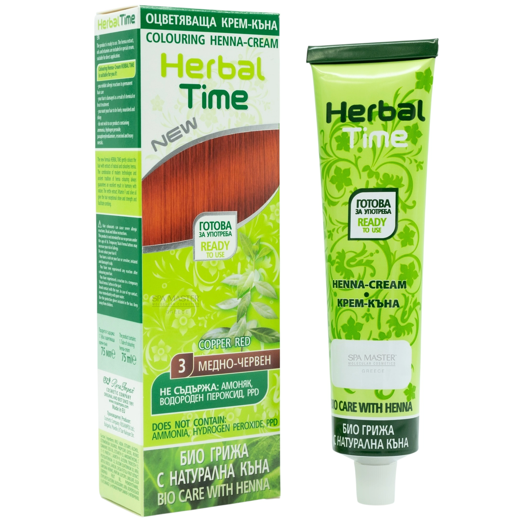 Η Herbal Time Έτοιμη Χέννα Μαλλιών Χάλκινο Κόκκινο – Copper Red N3 Herbal είναι μια φυσική κρέμα–χέννα σε σωληνάριο 75ml, έτοιμη για άμεση εφαρμογή χωρίς μίξεις και αναμονές.