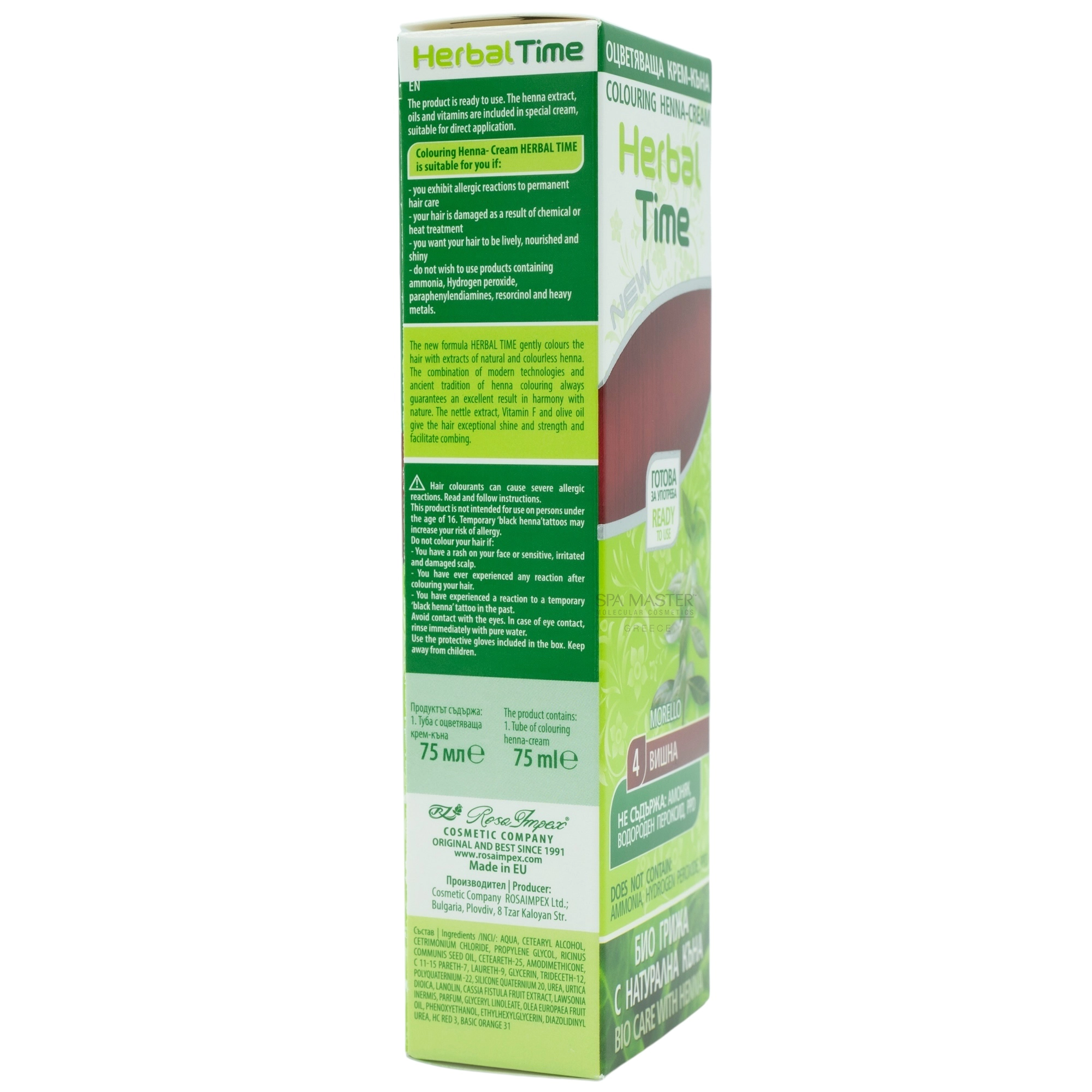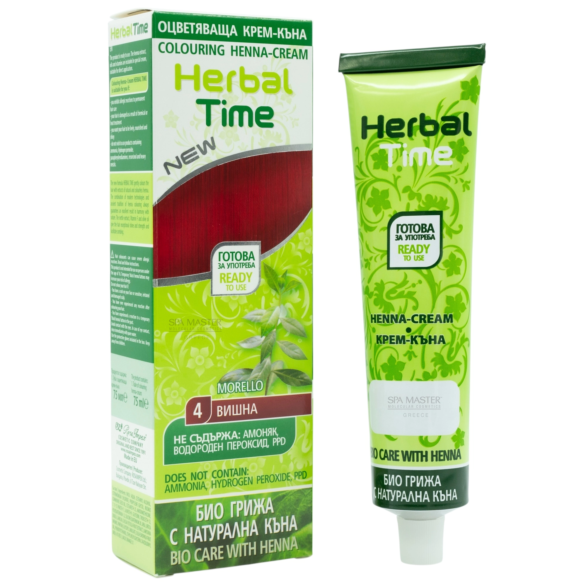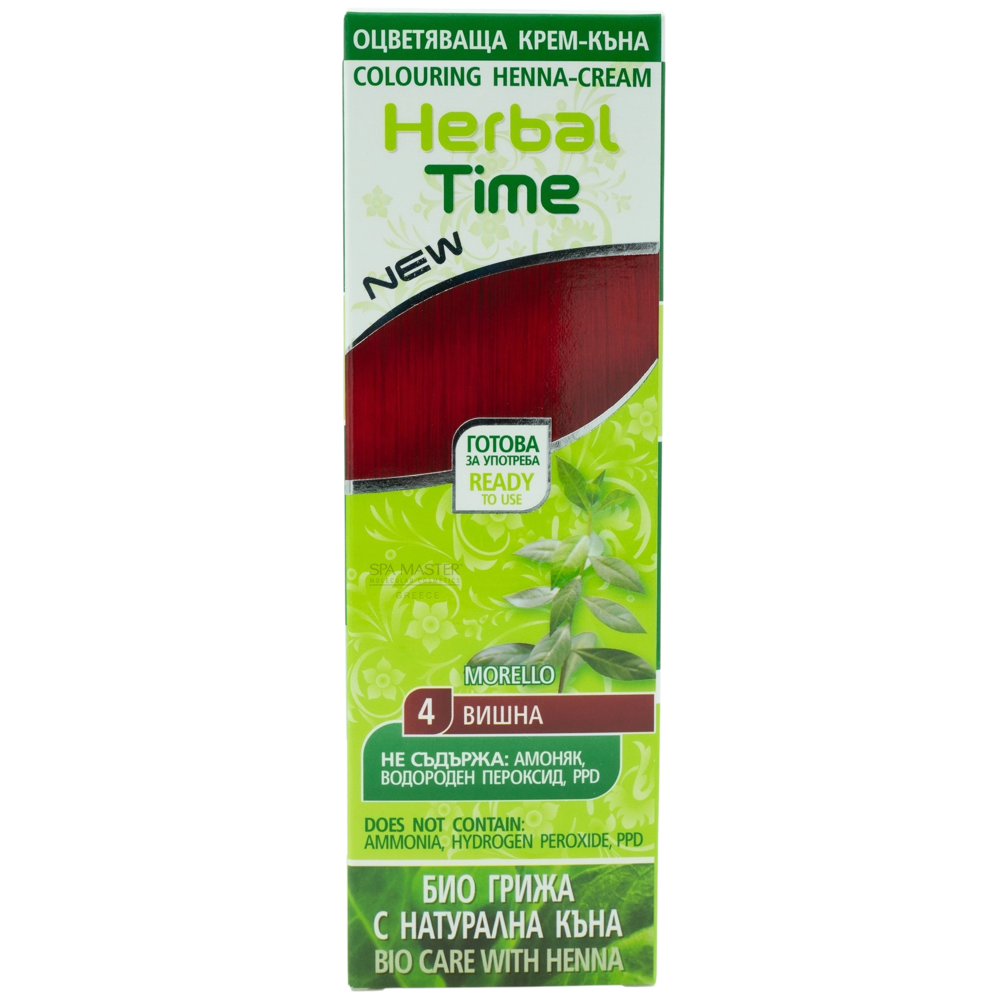 Η Herbal Time Έτοιμη Χέννα Μαλλιών Κόκκινο – Morello N4 Herbal είναι μια φυσική κρέμα–χέννα σε σωληνάριο 75ml, έτοιμη για άμεση εφαρμογή χωρίς μίξεις και αναμονές.
