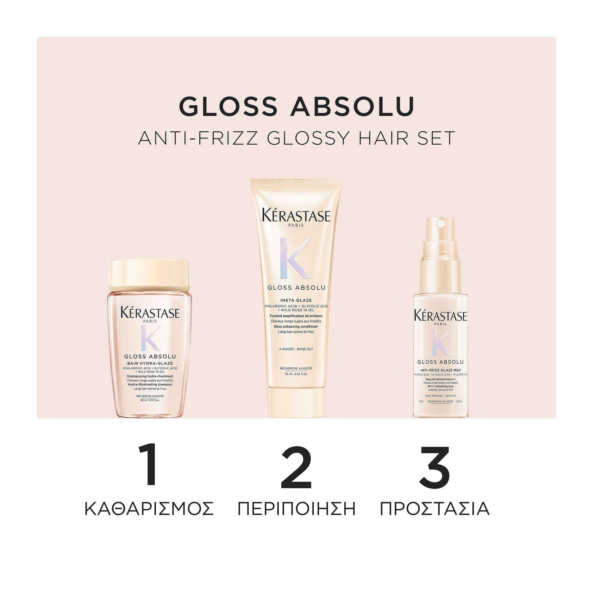 Kérastase Gloss Absolu Discovery Travel Set (Bain Hydra-Glaze Shampoo 80ml, Insta Glaze Conditioner 75ml, Anti-Frizz Glaze Milk 45ml) – Ολοκληρωμένη Ρουτίνα Λάμψης & Anti-Frizz σε Ταξιδιωτικό Μέγεθος