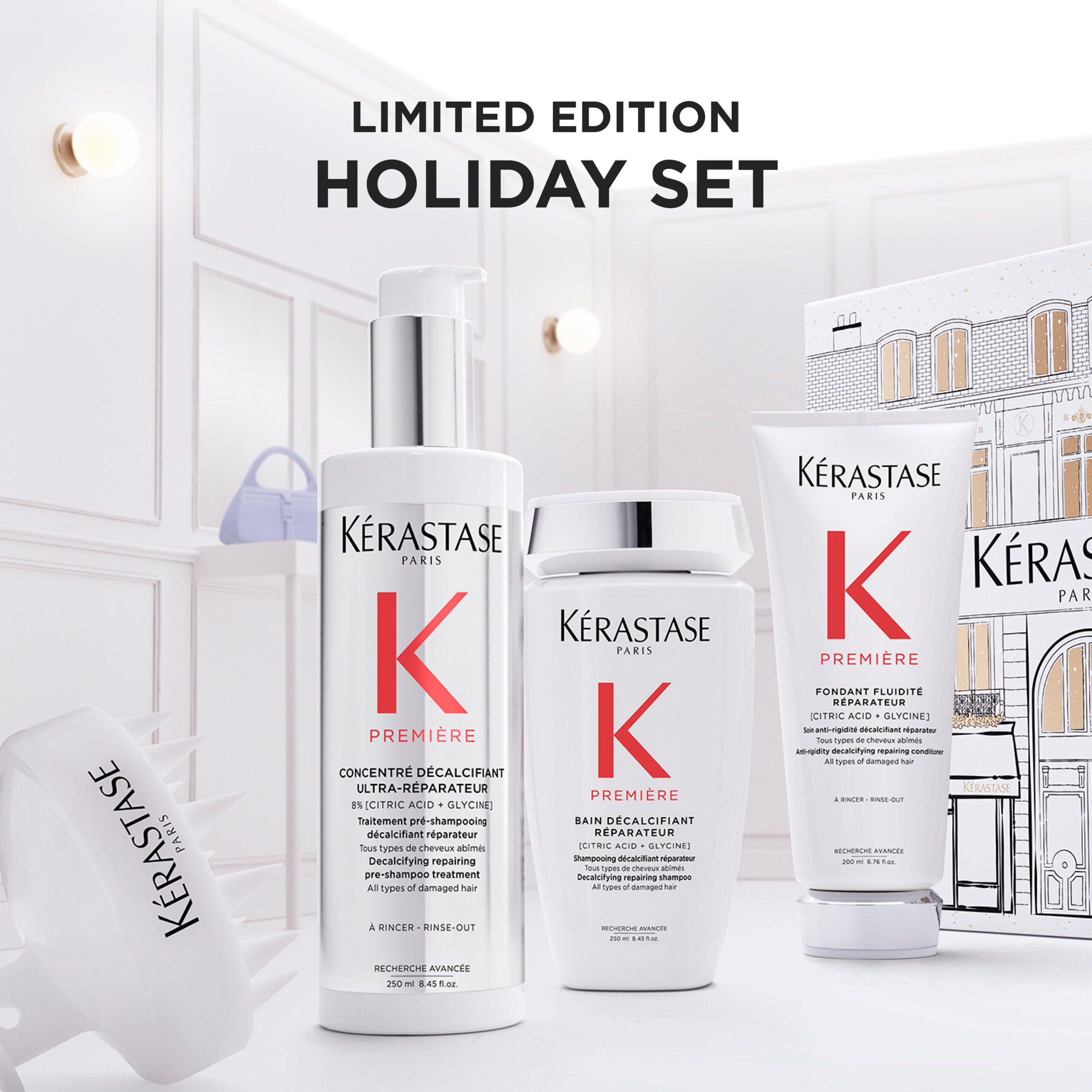Το Kérastase Première Limited Edition Set είναι ένα premium σετ περιορισμένης κυκλοφορίας, ειδικά σχεδιασμένο για ταλαιπωρημένα, εύθραυστα και φθαρμένα μαλλιά που έχουν χάσει τη δύναμή τους λόγω χημικών επεξεργασιών, θερμότητας ή σκληρού νερού. Συνδυάζει τρία κορυφαία προϊόντα της σειράς Première, τα οποία προσφέρουν διπλή δράση: αναδόμηση της τρίχας και απομάκρυνση του ασβεστίου που προκαλεί ακαμψία, θαμπάδα και σπάσιμο.