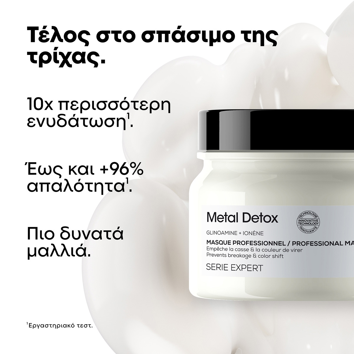 1️⃣ Εφαρμόστε σε νωπά, καθαρά μαλλιά, μετά το Metal Detox Shampoo.