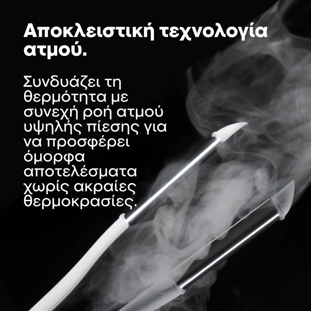 Steam Technology: συνεχής ροή ατμού που διατηρεί την υγρασία στο εσωτερικό της τρίχας, μειώνοντας το σπάσιμο και τη φθορά.