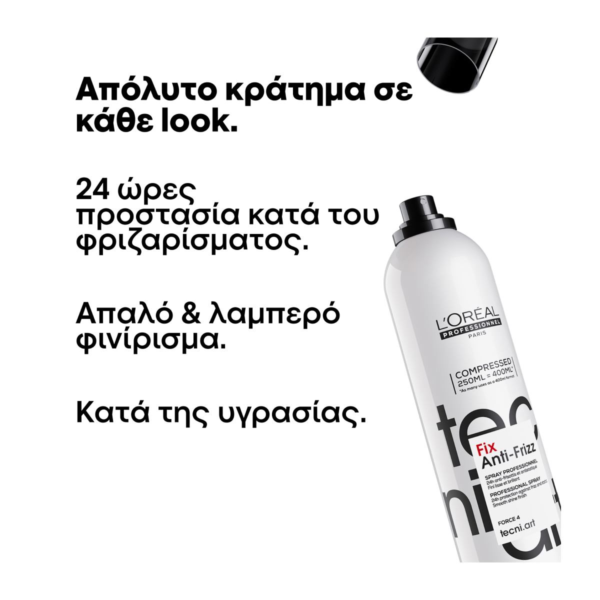 Το Tecni.ART Fix Anti-Frizz Spray της L’Oréal Professionnel είναι ένα επαγγελματικό σπρέι φιξαρίσματος με δυνατό κράτημα και αντιφριζαριστική προστασία, ειδικά σχεδιασμένο για να σταθεροποιεί το χτένισμα και να προστατεύει τα μαλλιά από τις επιπτώσεις της υγρασίας έως και 24 ώρες. Χαρίζει λαμπερό φινίρισμα, χωρίς κατάλοιπα και χωρίς να κολλάει τα μαλλιά.