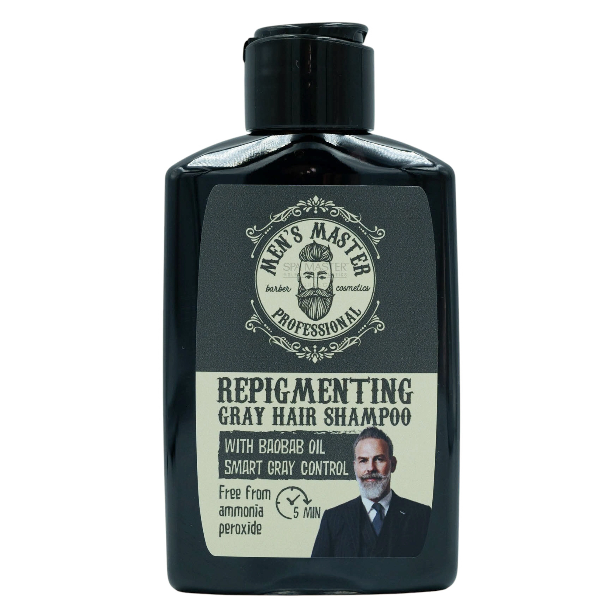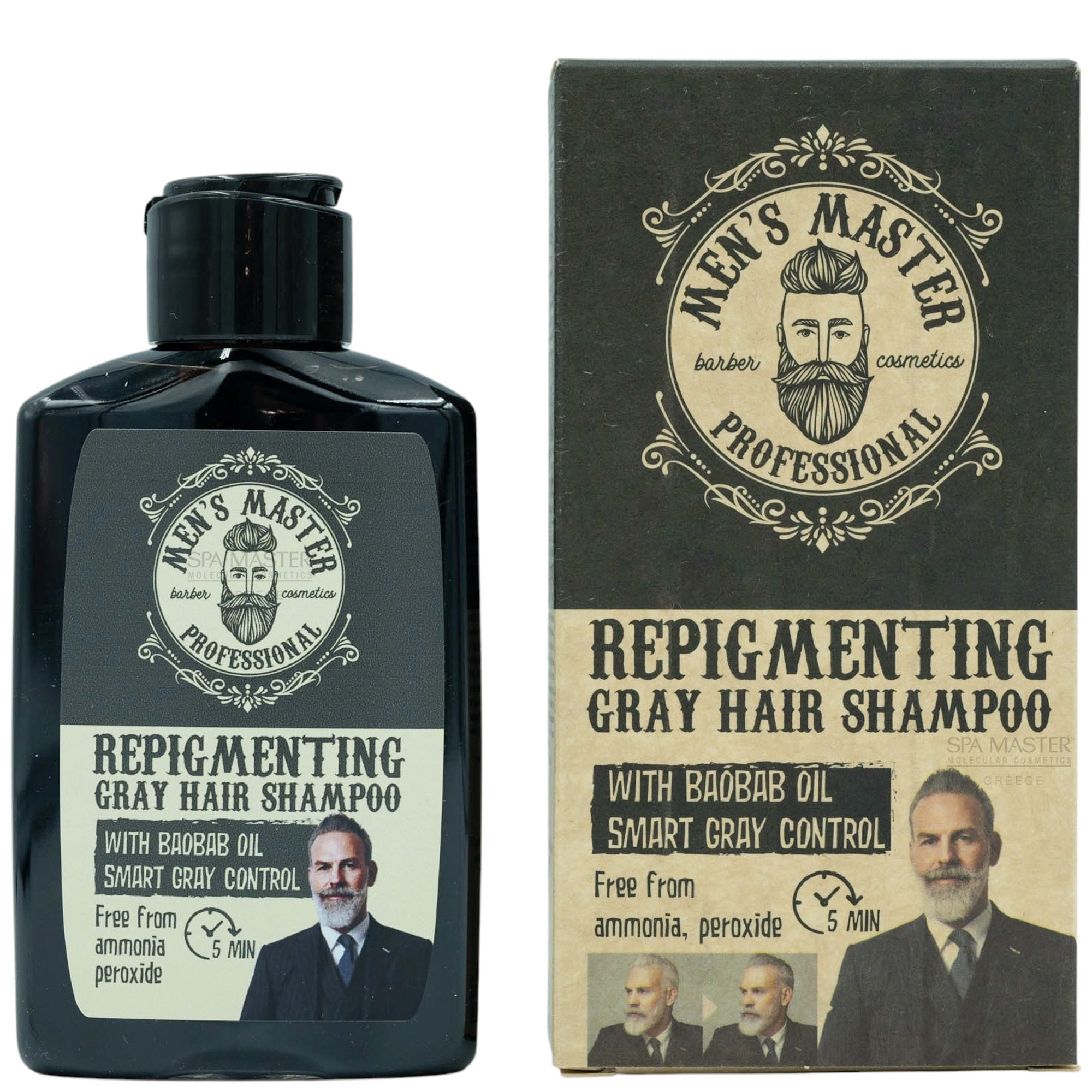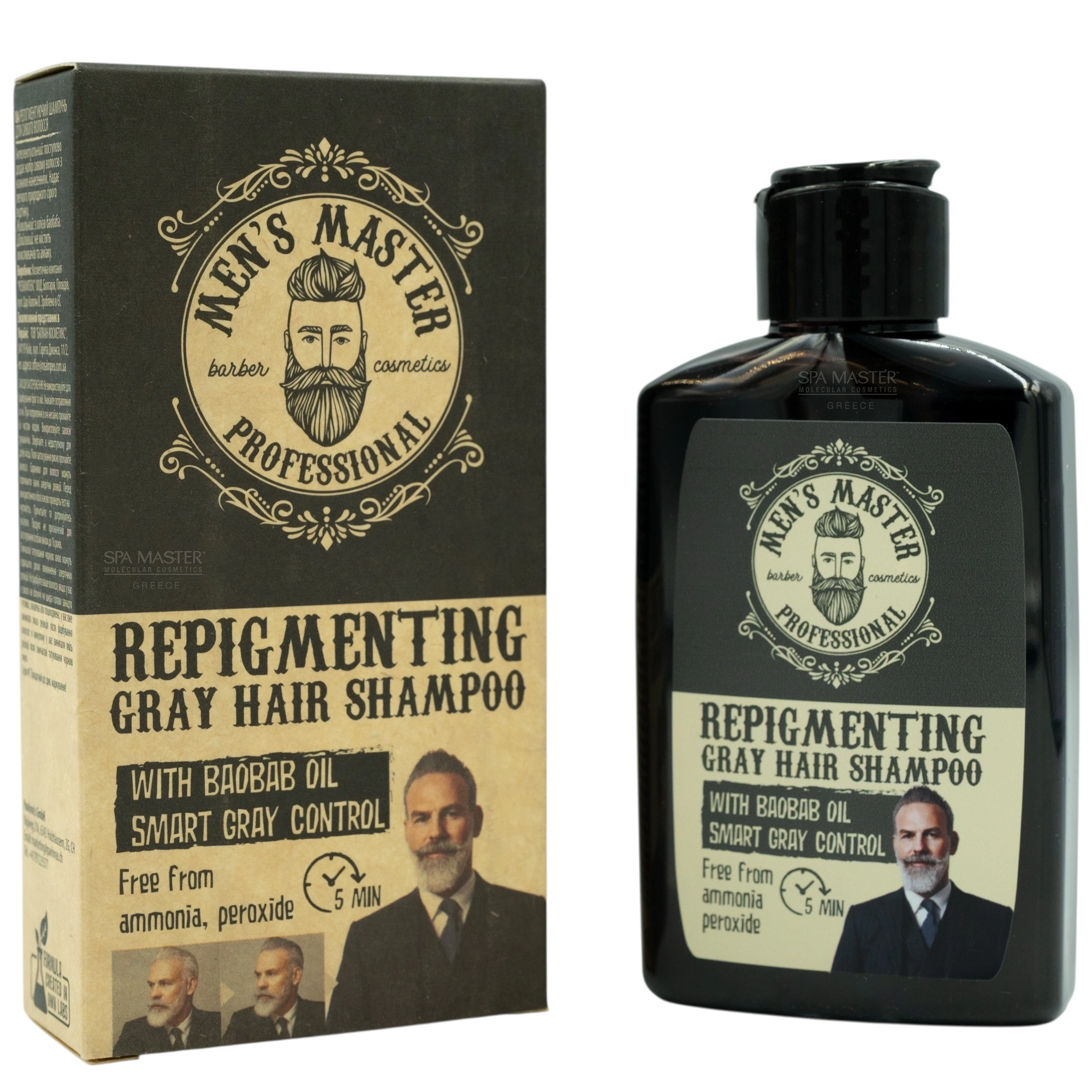 MEN’S MASTER Repigmenting Smart Gray Control Shampoo. Ανδρικό σαμπουάν επαναφοράς φυσικού χρώματος για γκρίζα μαλλιά και γένια, χωρίς μόνιμες βαφές. Με λάδι baobab για θρέψη & φυσικό αποτέλεσμα.