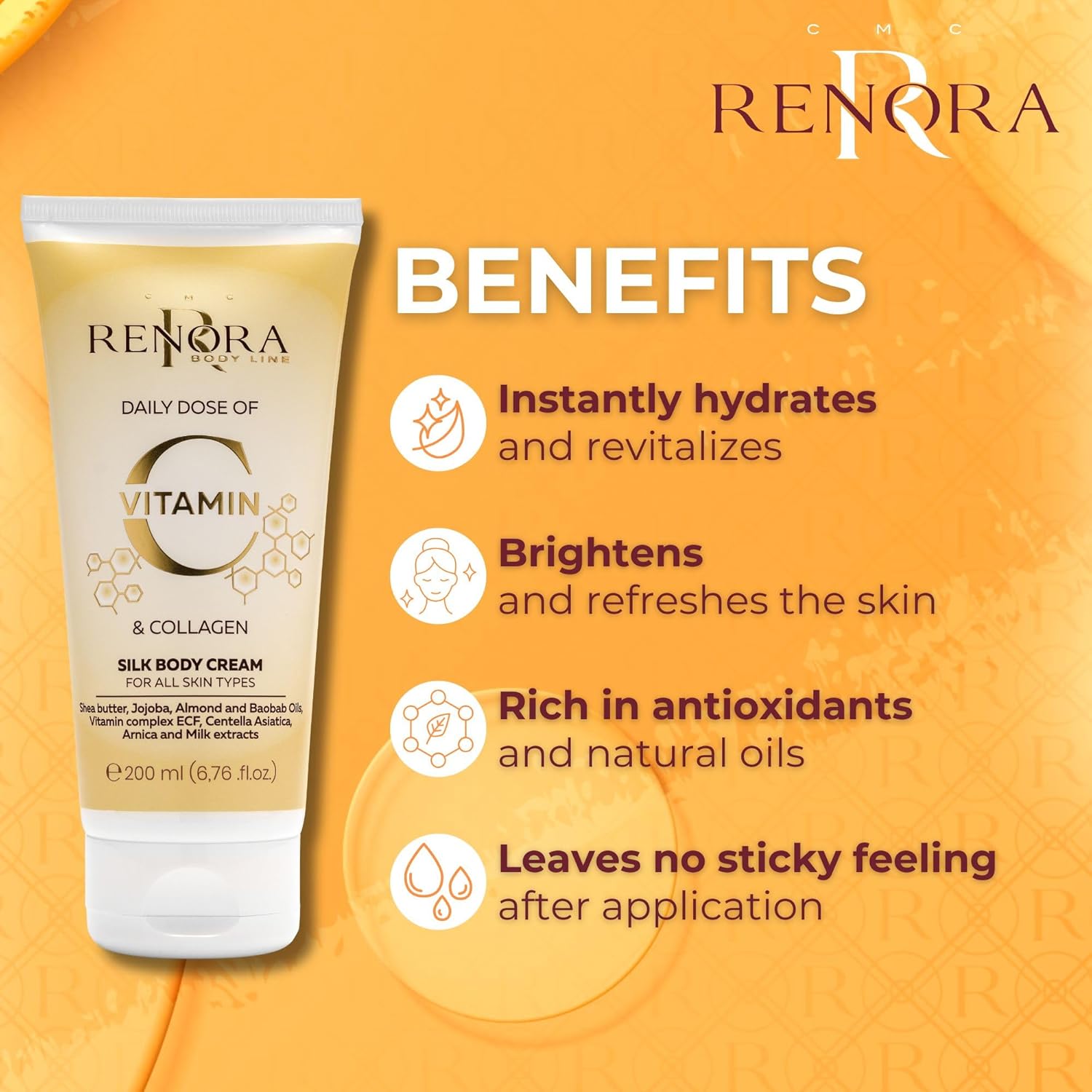 Η Silk Body Cream της Renora μεταμορφώνει την καθημερινή ενυδάτωση σε μια εμπειρία φροντίδας υψηλής αισθητικής. Εμπλουτισμένη με σταθεροποιημένη βιταμίνη C και υδρολυμένο κολλαγόνο, προσφέρει ενισχυμένη λάμψη, βαθιά θρέψη και βελτιώνει ορατά την ελαστικότητα του δέρματος.