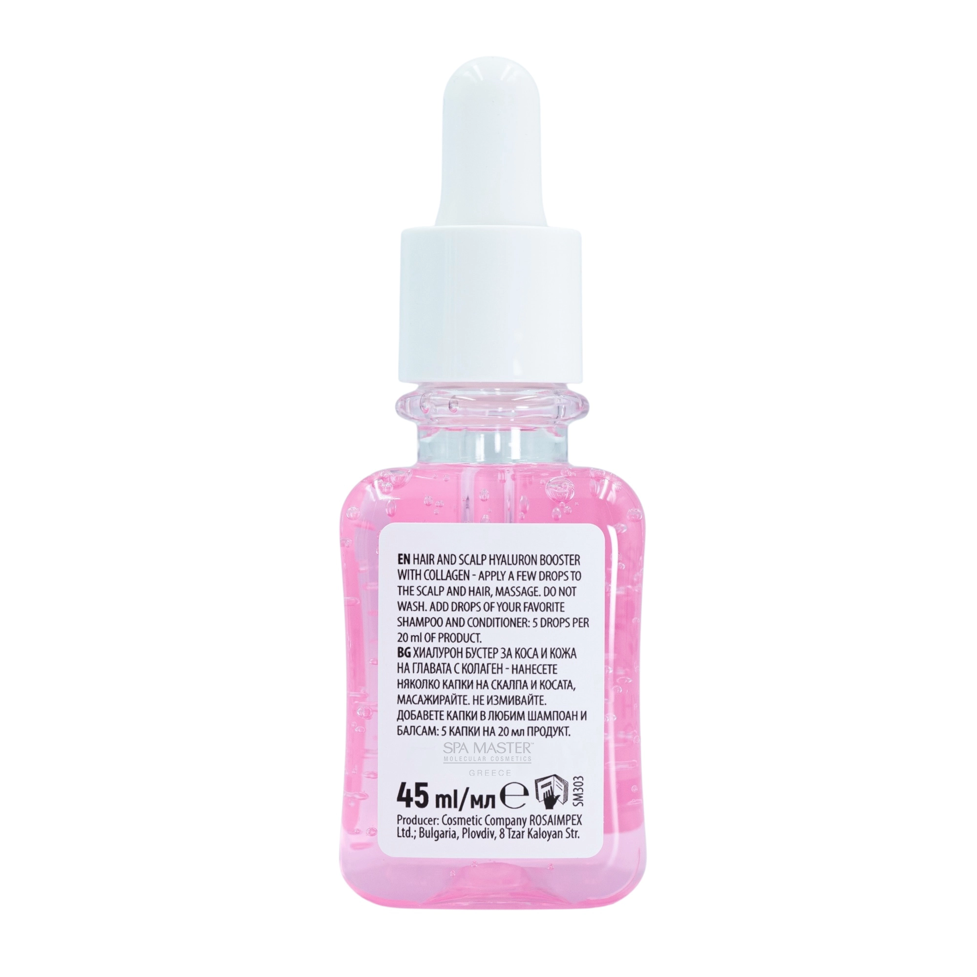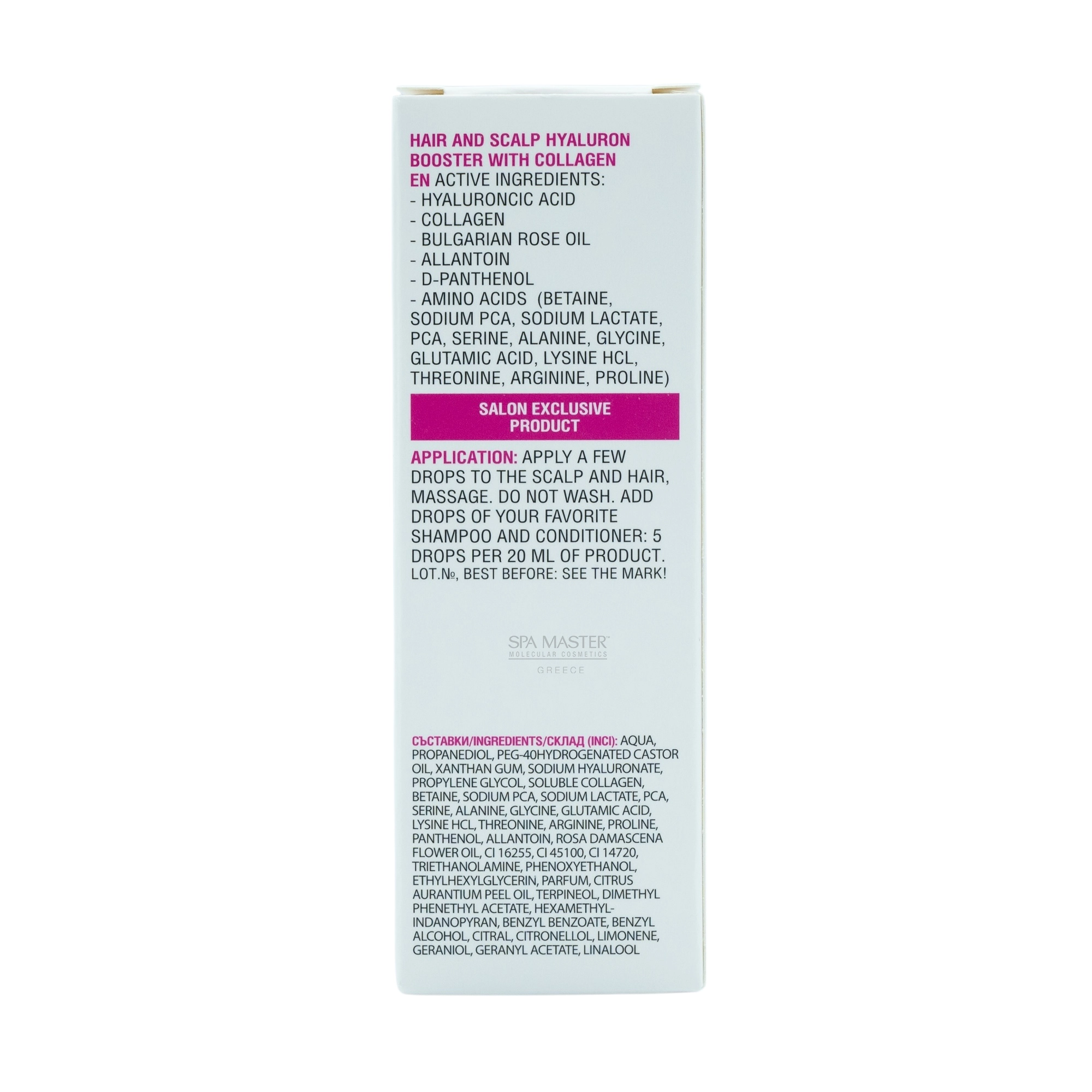 SPA MASTER Hyaluron & Collagen Booster είναι μια εξειδικευμένη φόρμουλα αναζωογόνησης και αντιγήρανσης για το τριχωτό και τα μαλλιά. Με συνδυασμό υαλουρονικού οξέος, κολλαγόνου και ροδέλαιου, προσφέρει εντατική ενυδάτωση, επανόρθωση της τρίχας και αντιοξειδωτική προστασία. Ιδανικό για όσους επιθυμούν να βελτιώσουν την ελαστικότητα, την απαλότητα και τη γενική υγεία της τρίχας και του δέρματος του κεφαλιού.