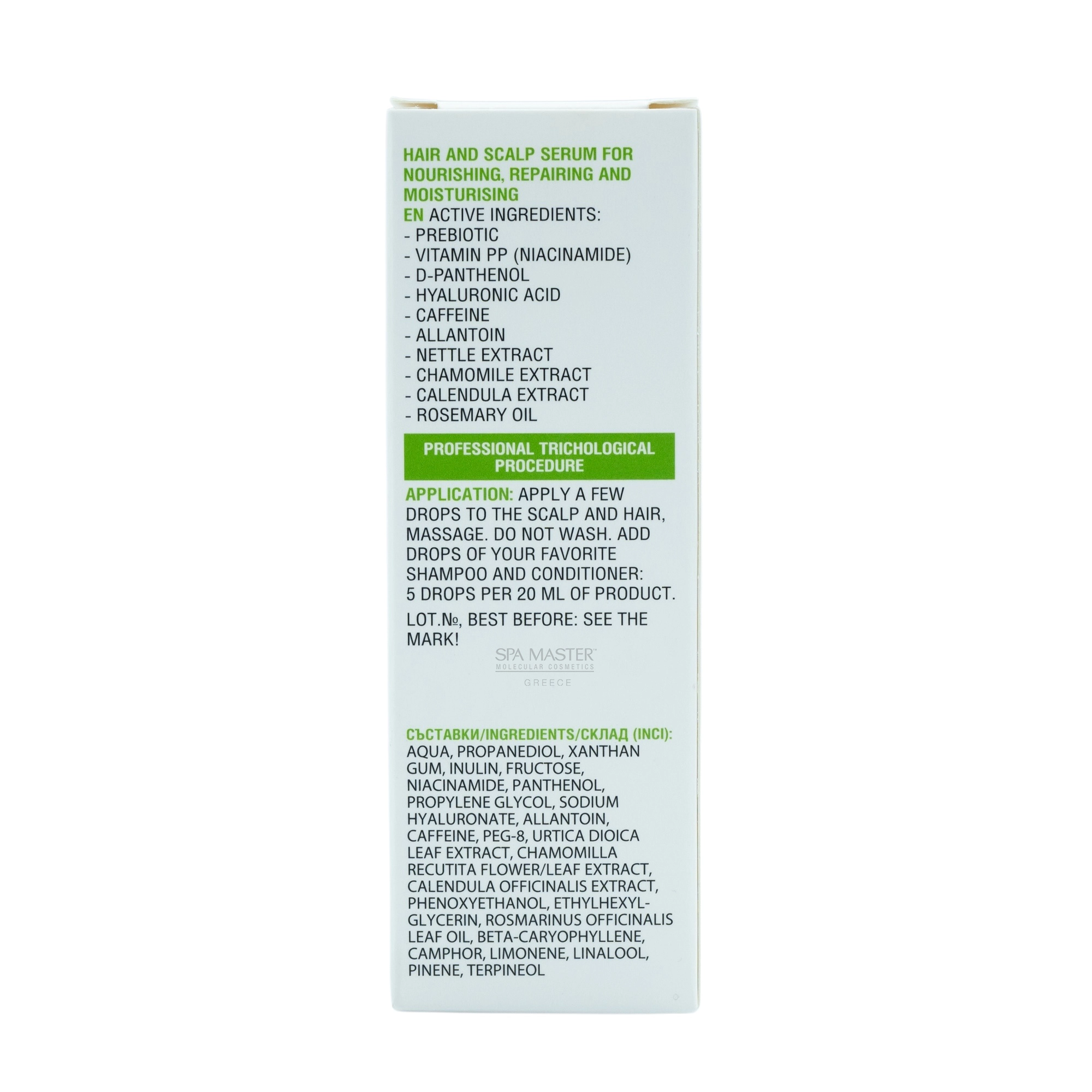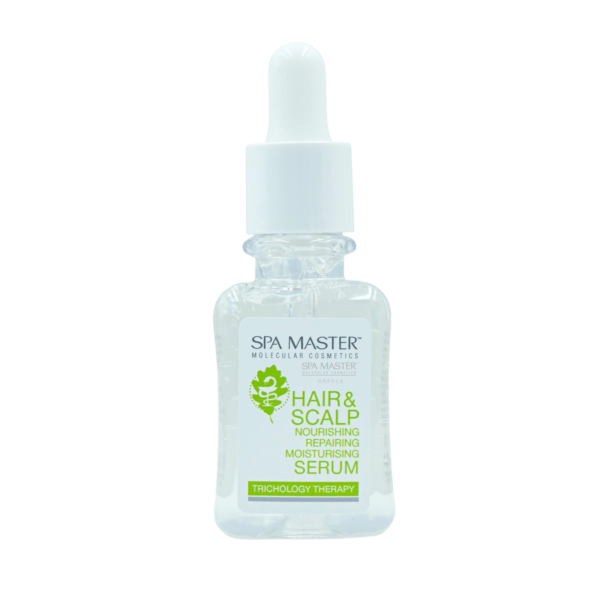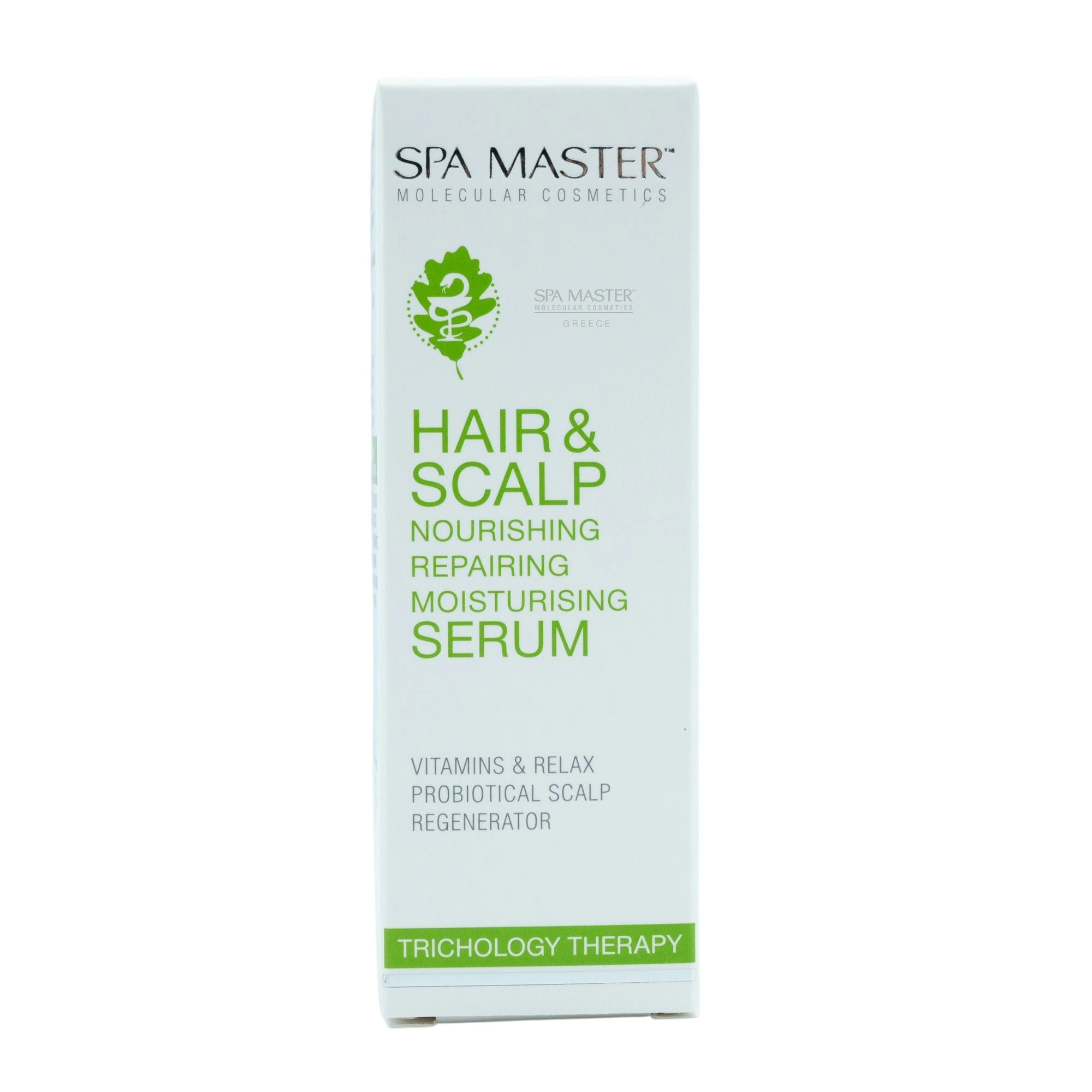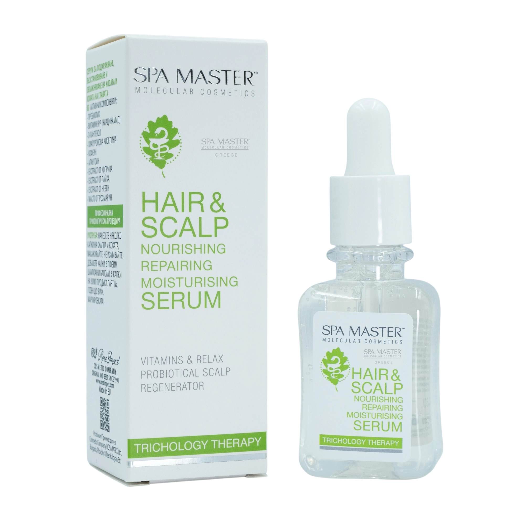 SPA MASTER Hair & Scalp Nourishing, Repairing & Moisturising Serum, έναν πολυλειτουργικό ορό από τη σειρά Trichology Therapy. Η σύνθεσή του με προβιοτικά, βιταμίνες, υαλουρονικό οξύ και φυτικά εκχυλίσματα, προσφέρει ολοκληρωμένη φροντίδα για το τριχωτό και τα μαλλιά, αποκαθιστώντας την ισορροπία, τη δομή και την υγιή όψη τους.